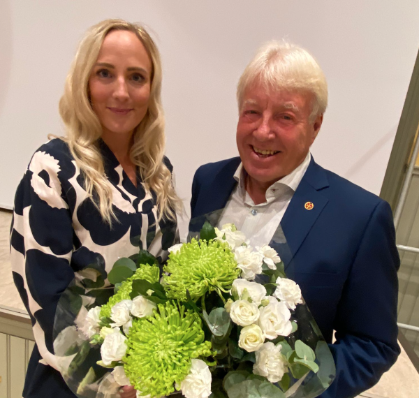 Rektor tillsammans med författaren till skolans historik. Ulf Sourander tackades med en blombukett för det gedigna arbetet med att sammanställa gymnasiets historik samt för den uppskattade presentationen för studerande, lärare och inbjudna gäster.